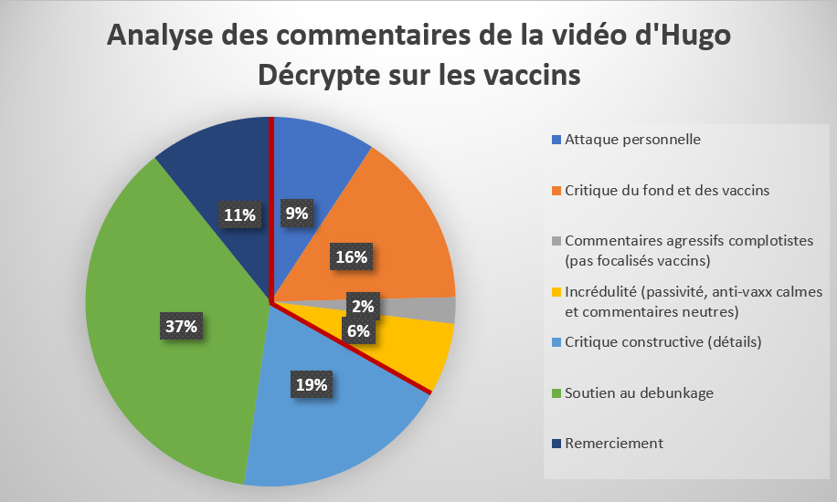 A l’aide d’un logiciel spécialisé, tous les commentaires de la vidéo d’Hugo Décrypte sur les vaccins (« LES VACCINS SONT-ILS DANGEREUX ? – Supprime ») ont été regroupés dans un tableau Excel. Les commentaires, ainsi que les réponses, étaient accessibles. Seuls les commentaires « spontanés », primaires, ont été pris en compte dans l’analyse. En effet, les réponses aux commentaires sont par essence pré-orientées et sont régies par des mécanismes sociologiques et psychologiques complexes qui ne relèvent pas de notre sujet. Ces commentaires initiaux, 130 au total, ont été décomposés en 7 catégories, comme ci-dessous (la ligne rouge représente la séparation entre les personnes favorables aux propos du debunkage et ceux contre) :