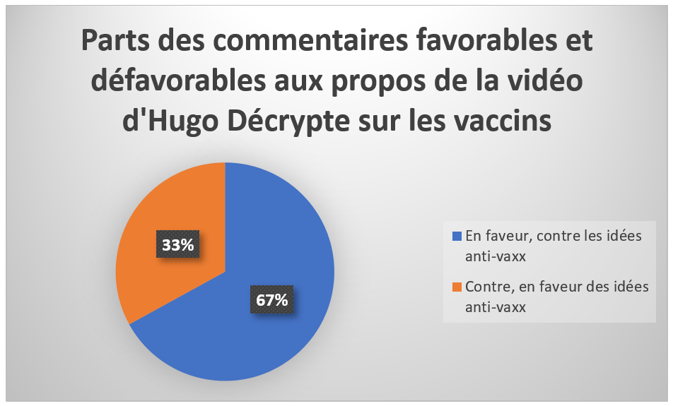 Tout d’abord, nous n’avons pas d’information précise sur l’échantillon. Nous savons uniquement qu’il est exclusivement composé d’utilisateurs de YouTube. Nous pouvons ainsi penser avec précaution que l’échantillon est plutôt jeune. Par extension, on peut affirmer humblement que le public est donc plus sensible au fact-checking que la moyenne mais que la part d’anti-vax et de complotistes est plus grande.