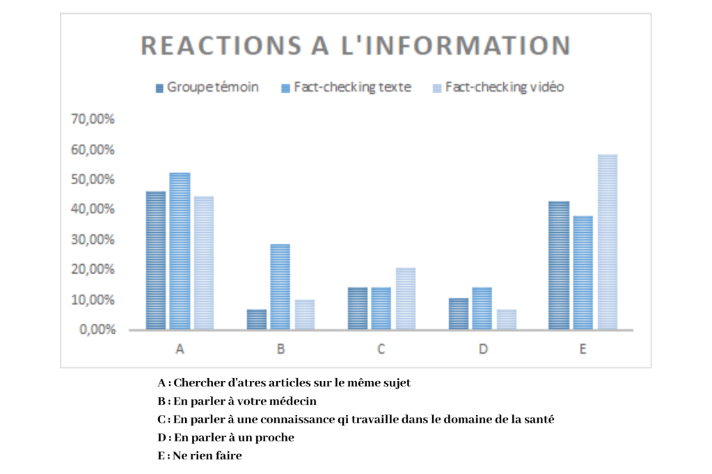 En revanche, aucune tendance claire ne ressort concernant d’éventuelles différences sur ce que les individus seraient amenés à faire après avoir eu connaissance de la fake news. Dans les trois cas, les comportements les plus fréquents consistent à ne rien faire ou à chercher d’autres articles sur le sujet. On observe une part importante du groupe « Fact-checking texte » voulant en parler à leur médecin. On peut donc imaginer que, face à des informations contradictoires (la fake news et le fact-checking), l’individu cherche à faire appel à une figure d’autorité (le médecin) pour trancher. Cependant, cela ne se retrouve pas dans pour le groupe « Fact-checking vidéo », ce qui est assez déroutant et ne valide pas cette hypothèse.