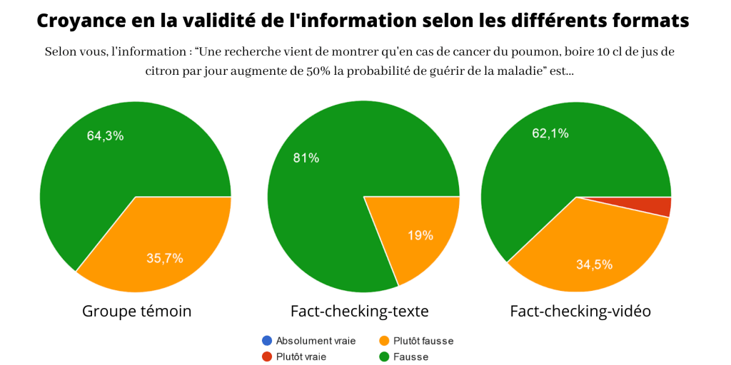 A l’inverse, les individus ayant visualisé le fact-checking sous forme de vidéo ne sont pas plus nombreux à considérer l’information comme fausse que ceux du groupe témoin (respectivement 62,1% et 64,3%).