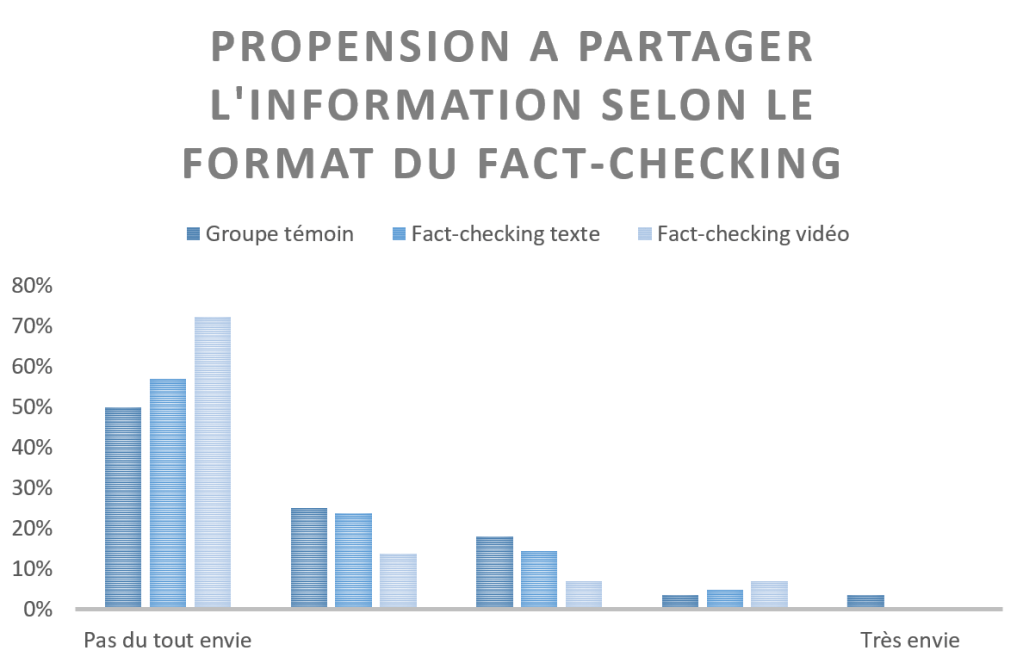 En effet, la proportion d’individus n’ayant pas du tout envie de partager l’information augmente sensiblement si l’on considère la population d’individus ayant eu accès au fact-checking. Ainsi, alors que 50% des individus du groupe témoins n’ont pas du tout envie de partager l’information, ils sont 57% chez les individus du groupe « fact-checking textuel » et 72% chez les individus du groupe « fact-checking vidéo ».