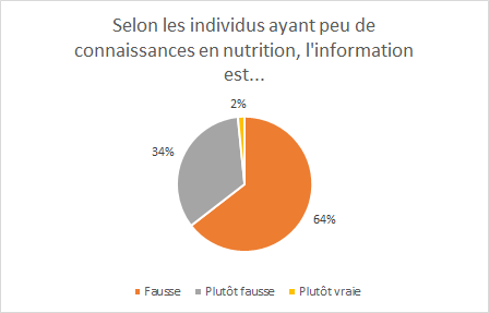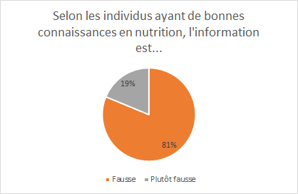 De manière générale, c’est-à-dire les trois groupes confondus, les individus ayant de bonnes connaissances dans le domaine de la santé et de la nutrition considèrent plus l’information comme fausse. Cela va dans le sens de l’hypothèse H2. Nous considérons qu’un individu a de bonnes connaissances dans ces sujets s’il a répondu correctement à au moins quatre questions sur les six posées dans notre questionnaire. 81 % des individus ayant de bonnes connaissances nutritives considèrent que l’information est fausse contre seulement 64% des individus ayant peu de connaissances en ces domaines.