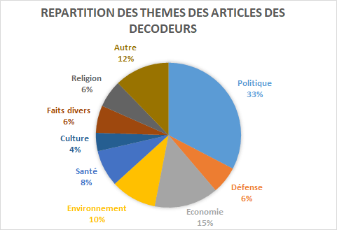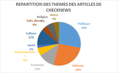 Nous avons donc quantifié la proportion des thèmes des informations vérifiées par trois rubriques de médias connus et reconnus pour leur travail de fact-checking en France : AFP factuel, Les décodeurs, Checknews. Il faut noter la spécificité de ce dernier puisque dans son cas, les journalistes répondent aux questions des lecteurs et ne choisissent donc a priori pas leurs sujets eux-mêmes. En effet, les journalistes de Checknews affirment : « Nous essayons de répondre à tout » en apposant seulement trois restrictions : il faut que la question présente un intérêt pour un grand nombre de personnes, qu’elle ne soit pas trop large ni ne concerne la vie privée des individus. Nous pourrions donc penser que la répartition des thèmes des articles reflète les besoins de la population.