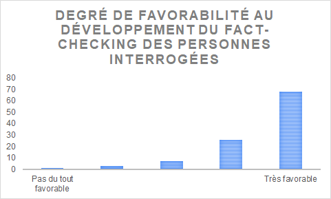 Cette familiarité s’accompagne d’un réel plébiscite pour le fact-checking puisque près de 90% des personnes interrogées se sont dites favorables ou très favorables au fact-checking. Cela peut être un symptôme d’une impression générale de présence importante des fake news dans notre société actuelle. Le fait que 70% des individus de notre échantillon considéraient que les fake news sont très ou assez présentes dans les informations va dans ce même sens.