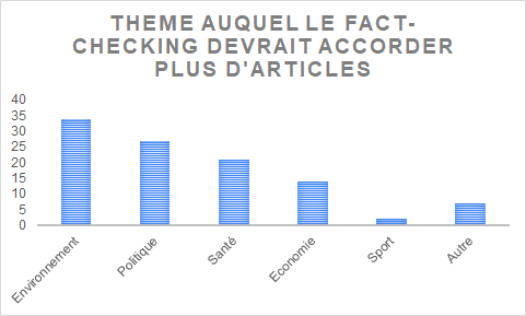 - L’environnement est assez peu traité mais atteint tout de même 10 % aux Décodeurs. Cependant, c’est l’un des thèmes qui est plébiscité par le public si l’on en croit notre enquête, puisque un tiers de l’échantillon considère qu’il s’agit du thème qui devrait être plus traité par le fact-checking.