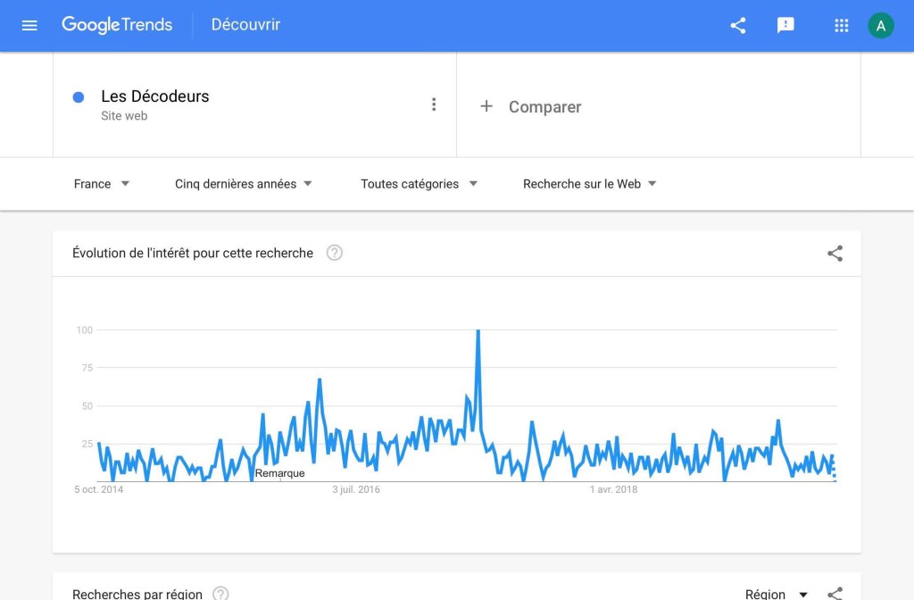 Ce graphique indique la fréquence de recherche du site « Les Décodeurs » du Monde (premier site connu selon notre sondage) depuis octobre 2014. Un pic, situé entre le 30 avril 2017 et le 6 mai 2017, se détache clairement. Or, cela coïncide directement avec les dates des élections présidentielles en France (23 avril et 7 mai pour le premier et second tour). Ce sont des résultats dont on peut se douter, soit. Mais l’utilisation d’outils tels que Google Trends nous permet de les représenter graphiquement et de les quantifier de manière plus précise qu’une première approche basée sur des suppositions. L’étude de phénomènes controversés nécessitent l’usage de données claires et fiables. Cela montre l’articulation étroite qui existe entre fact-checking et politique. Cela peut signifier que les internautes, en période électorale – une période où chaque parole politique compte et est donc scrutée -, utilisent particulièrement le fact-checking.